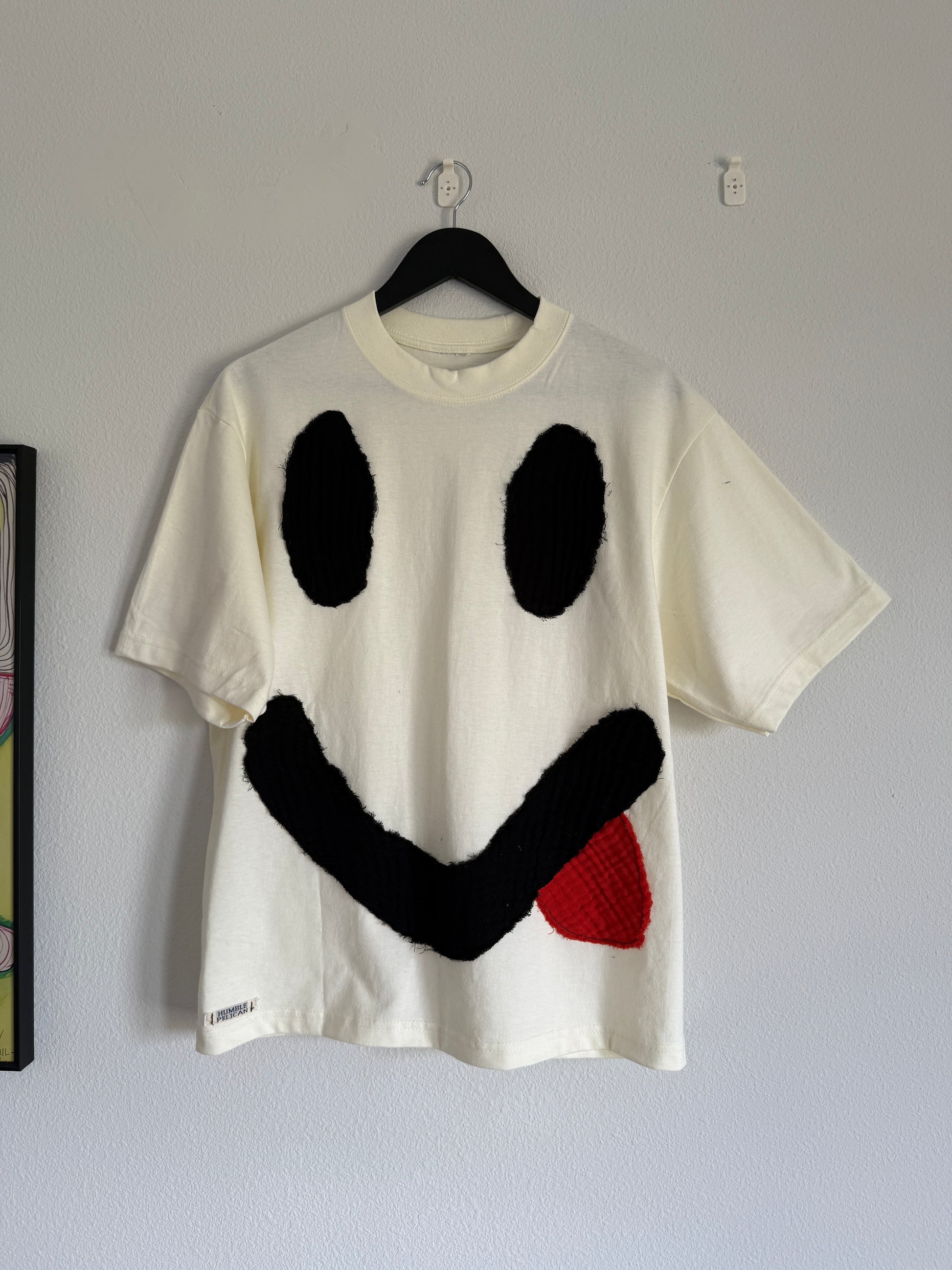 Add some personality to your wardrobe with our one-of-a-kind handmade patch shirt. Each shirt features a bold, oversized smiley face with a playful tongue-out design, hand-sewn with textured fabric for a fun, 3D look. Whether you’re looking for a gift or your next favorite tee, this shirt is guaranteed to bring smiles (literally).